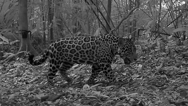 You might wonder why the black and white picture of the jaguar. This is a camera trap picture from one of our corridor-projects. Success of such a corridor is measured by the return to them of big felines, like the jaguar.